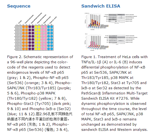 CST的PathScan® Inflammation Multi-Target Sandwich ELISA Kit #7276能够检测内源水平的六个蛋白: NF-κB p65, phospho-NF-κB p65 (Ser536), phospho-SAPK/JNK (Thr183/Tyr185), phospho-p38 MAPK (Thr180/Tyr182), phospho-Stat3 (Tyr705)和phospho-IκB-α (Ser32)。如图1所示,用多种细胞因子处理后能观察到随时间推移这些蛋白的不同激活方式。细胞的裂解液蛋白浓度与450 nm吸光度之间的关系在与单个的PathScan® Sandwich ELISA kits**相关的数据页中。**参考配套产品。此试剂盒能够检测已经经内部严格测试的物种的蛋白,但是也不排除检测到其它物种中同源性的蛋白。CST的PathScan® Inflammation Multi-Target Sandwich ELISA Kit是固相夹心酶联免疫吸收剂检测试剂盒(ELISA),试剂盒中包含检测内源水平NF-κB p65, phospho-NF-κB p65 (Ser536), phospho-SAPK/JNK (Thr183/Tyr185), phospho-p38 MAPK (Thr180/Tyr182), phospho-Stat3 (Tyr705) and phospho-IκB-α (Ser32)蛋白所需的试剂。这些分子代表了控制胁迫和炎症信号通路中重要的调节蛋白和结点蛋白。为每个目标蛋白提供了十六次测试。对已经标明的目标蛋白特异的实验验证能够在与单个PathScan® Sandwich ELISA Kits**相关的数据页中找到。简单的讲, 一个扑捉抗体*包裹到微孔的表面。与细胞裂解液孵育后, 微孔表面的抗体捕捉目标蛋白。经过严格的冲洗后,检测抗体*加入后检测已经捕捉到的目标蛋白。HRP连接的二抗加入用于识别检测抗体的结合。HRP的底物TMB加入进行显色反应。对反应的颜色,吸光度的数值按比例换算成目标蛋白的量。*试剂盒中的抗体是经过客户验证的特异性抗体。 **见配套产品。核转录因子κ B(NF-κB)/Rel 家族在炎症反应和免疫反应中发挥了至关重要的作用(1,2)。在哺乳动物中一共有5个家族 : RelA, c-Rel, RelB, NF-κB1 (p105/p50), 和 NF-κB2 (p100/p52)。这些蛋白以二聚体转录因子形式发挥作用。在未受到刺激的细胞中, NF-κB/Rel蛋白被隔离在细胞质中并被IκB蛋白所抑制 。NF-κB激活因子包括磷酸化的IκB蛋白,目的是降解它们并释放NF-κB/Rel复合体。激活的NF-κB/Rel 复合体通过磷酸化进一步的激活(1-4)。胁迫激活的蛋白激酶Jun N-末端激酶SAPK/JNK是通过环境中一系列的胁迫而激活,包括UV和gamma射线,神经酰胺,炎症因子、在某些情况下通过生长因子和GPCR激动剂(5-10)。与其它的MAPKs类似, 信号的中心单元是MAPKKK, 通常是MEKK1-4或者是混合的同谱系激酶(MLK), 它能够磷酸化并激活MKK4-7,然后磷酸化Thr183和Tyr185位点激活SAPK/JNK激酶(6)。胁迫信号是通过 Rho家族(Rac, Rho, cdc42)的小GTPases而传递到此级联反应(7)。Rac1和cdc42介导对MEKKs和MLKs的刺激(7)。或者作为另一种选择, MKK4-7 能够不依赖小GTPases而是通过刺激幼芽的中心激酶(GCK)家族中的一员而激活(8)。