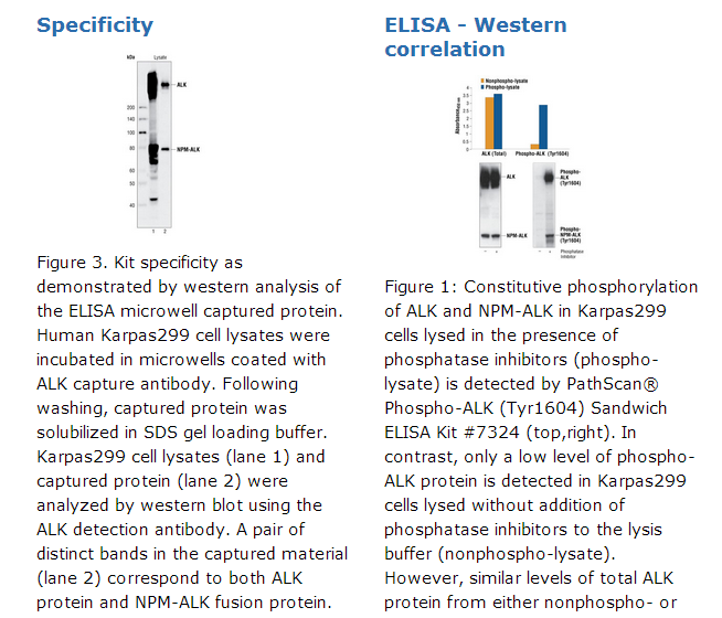 CST公司的PathScan®总ALK双抗夹心法化学发光检测试剂盒#7322主要用于检测内源性总ALK蛋白和融合蛋白NPM-ALK的表达。ALK和NPM-ALK融合蛋白在Karpas299细胞中被组成性地磷酸化,因此在该细胞系中能检测到磷酸化的ALK (Tyr1586)和磷酸化的NPM-ALK融合蛋白的高水平表达(图 1)。这种高水平的表达在向Karpas299细胞裂解液中加入磷酸酶抑制剂* 后(即不含磷酸化蛋白的细胞裂解液)中被消除。而用PathScan®总ALK双抗夹心法酶联免疫检测试剂盒#7322对总ALK (磷酸化和非磷酸化) 的检测结果没有改变(图 1)。用免疫印迹法检测微孔中被包被的抗ALK抗体捕获的蛋白,在对应ALK 蛋白和NPM-ALK 融合蛋白的位置上都显出两条带(图 3)。内部检测显示,本试剂盒能检测列举出的物种蛋白,但不排除用于其它物种同源蛋白检测的可能。*,磷酸酶抑制剂,包括焦磷酸钠、β-甘油磷酸二钠和Na3VO4。CST公司的PathScan®总ALK双抗夹心法酶联免疫检测试剂盒利用固相双抗夹心酶联免疫检测法(ELISA)对内源性的总ALK蛋白和融合蛋白NPM-ALK的表达进行检测。微孔中已经包被了抗ALK的兔源抗体,与细胞裂解液共孵育后,ALK和NPM-ALK融合蛋白(磷酸化的和未磷酸化的)能够被包被抗体捕获。多次洗板之后,加入另一种抗ALK的小鼠源抗体对ALK和NPM-ALK融合蛋白进行检测,然后加入HRP标记的抗小鼠的IgG#7076*对检测抗体进行识别,最后加入HRP的底物TMB检测信号。按照相对光单位,发射光强度与总ALK和NPM-ALK融合蛋白的量成正比。试剂盒中的抗体为试剂盒特异定制配方。间变性淋巴瘤激酶(ALK)是多效生长因子(PTN)的酪氨酸激酶受体,它是大脑胚胎发育过程中的生长因子(1-3)。 在表达ALK的细胞中,PTN诱导ALK及其下游效应因子IRS-1, Shc, PLCγ, 和PI3K激酶发生磷酸化(1)。ALK最初是从易位突变产生的NPM-ALK融合蛋白而被发现的(4)。NPM-ALK融合蛋白是一个组成性活化,有原癌基因活性的间变性淋巴瘤相关酪氨酸激酶(4)。 由NPM-ALK介导的PLCγ的活化可能对有丝分裂活性起到关键作用,并且可能对间变性淋巴瘤的发病过程很重要(5)。另一个完全不同的ALK原癌融合蛋白在非小细胞肺癌细胞株中被报道,该蛋白融合了ALK与EML4,其相应融合转录产物在一些肺腺癌中也有表达。在EML4-ALK融合蛋白中,微管相关蛋白EML4的短氨基末端区域和ALK的激酶活性区域融合在一起(6,7)。