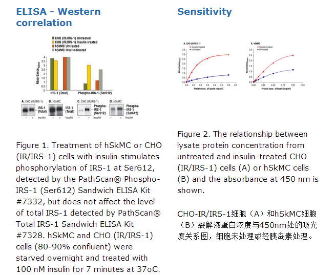 PathScan® Phospho-IRS-1 (Ser612) Sandwich ELISA Kit #7332用于检测内源性在612位丝氨酸残基上磷酸化的IRS-1水平。如1图所示,所示为hSkMC和CHO(IR/IRS-1)细胞经胰岛素处理后, Ser612磷酸化的胰岛素受体底物1水平明显提高,所用抗体为Phospho-IRS-1 (Ser612) Sandwich ELISA Kit #7332。但是Western检测和PathScan® Total IRS-1 Sandwich ELISA Kit #7328检 测(figure1)所示IRS-1(磷酸化和未磷酸化的)总水平没有变化。内部试验证明,该抗体用于检测相应物种的蛋白,但也可能与其它物种的同源蛋白交叉反应。PathScan® Phospho-IRS-1 (Ser612) Sandwich ELISA Kit是一种固相三明治酶连免疫吸收试验(ELISA)试剂盒,用于检测内源性612位丝氨酸磷酸化的IRS-1(也称作4PS)蛋白。步骤如下:首 先在微孔中结合有固相的兔抗IRS-1抗体,然后将细胞裂解液于固相抗体中孵育,IRS-1(磷酸化与非磷酸化的)蛋白被固相抗体所捕获。经过洗脱后,非特异性结合的成分被洗脱下来,然后加 入鼠源磷酸化IRS-1(Ser612)检测抗体来检测被捕获的磷酸化IRS-1(Ser612)蛋白,然后再加入辣根过氧化物酶耦联的抗体来检测特异性结全的检测抗体。最后加入辣根过氧化物酶的底物 TMB来进行显色。Ser612磷酸化IRS-1的浓度与显色的强度成正比,因此可以借此对IRS-1定量。试剂盒中的抗体是专门定做的。胰岛素受体底物1(IRS-1)是胰岛素受体激酶的一类主要底物(1)。 IRS-1包含多个酪氨酸磷酸化位点,可以作为含SH2结构域蛋白的停靠位点,这些蛋白调控着胰岛素的代谢和促生长功能(2-4)  。IRS-1还包含着起过30个潜在的丝氨酸/苏氨酸磷酸化位点,307位丝氨酸可以被JNK(5)和IKK(6)磷酸化,789位的丝氨酸可以被SIK-2(是AMPK家族成员)磷酸化(7)。PKC和mTOR途径可以分 别磷酸化IRS-1的612位丝氨酸和636/639位丝氨酸(8,9)。PKCθ可以介导IRS-2在1101位丝氨酸位的磷酸化,此位点的磷酸化会导致细胞胰岛素信号通路的抑制,因此它可能在某些肥胖模型的 胰岛素抵抗中起着某些作用(10)。
