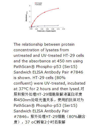 CST's PathScan® Phospho-p53 (Ser15) Sandwich ELISA Antibody Pair is being offered as an economical alternative to our PathScan® Phospho-p53 (Ser15) Sandwich ELISA Kit #7365. Capture and Detection antibodies (100X stocks) and HRP-conjugated secondary antibody (1000X stock) are supplied. Sufficient reagents are supplied for 4 x 96 well ELISAs. The p53 Capture Antibody is coated in PBS overnight in a 96 well microplate. After blocking, cell lysates are added followed by a Phospho-p53 (Ser15) Detection Antibody and anti-Mouse IgG, HRP conjugated antibody. HRP substrate, TMB, is added for color development. The magnitude of the absorbance for this developed color is proportional to the quantity of phospho-p53 (Ser15) protein. *Antibodies in this kit are custom formulations specific to the kit.
