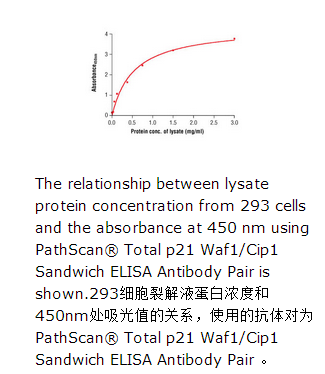 CST's PathScan® Total p21 Waf1/Cip1 Sandwich ELISA Antibody Pair is being offered as an economical alternative to our PathScan®Total p21 Waf1/Cip1 Sandwich ELISA Kit #7167. Capture and detection antibodies (100X stocks) and HRP-conjugated secondary antibody (1000X stock) are supplied. Sufficient reagents are supplied for 4 x 96 well ELISAs. The p21 Waf1/Cip1 mouse capture antibody is coated on a 96 well microplate in PBS overnight. After blocking, cell lysates are added followed by a p21 Waf1/Cip1 rabbit detection antibody and anti-rabbit IgG, HRP conjugated antibody. HRP substrate (TMB) is added for color development. The magnitude of the absorbance for this developed color is proportional to the quantity of total p21 Waf1/Cip1 protein.