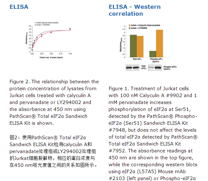 PathScan® Total eIF2α Sandwich ELISA Kit #7952检测在人源细胞中内源性mTOR总蛋白(如图1所示)。该试剂盒的敏感性如图2所示。通过内部实验确定,该试剂盒可检测指定的物种,但是可能也会检测其它物种的同源性蛋白。该PathScan® Total eIF2α Sandwich ELISA Kit是一个固相夹心酶联免疫吸附法(ELISA),其能检测内源性eIF2α蛋白。一个eIF2α兔单抗已经被包被在微孔板上。在与细胞裂解液一起孵育后,eIF2α (磷酸和非磷酸的)蛋白被包被的抗体吸附。在充分清洗后,一个eIF2α鼠源抗体被加入以检测已被吸附的eIF2α蛋白。然后,HRP连接的抗体被用于识别已结合的检测抗体。加入HRP底物TMB后显色。该颜色的吸光度值的大小与eIF2α总蛋白定量成正比例。试剂盒里的抗体是专门针对该试剂盒定制的。研究证明在不同的应激条件下真核生物起始因子2 (eIF2) α亚型的磷酸化可下调蛋白质的合成。eIF2蛋白与GTP以及起始tRNA(Met-tRNAi)结合,然后将Met-tRNA转移到40S核糖体亚基上共同形成43S前起始复合物(1,2)。eIF2通过eIF2B催化反应将GTP交换GDP从而促进新一轮翻译的起始(1,2)。病毒感染(PKR)、内质网应激(endoplasmic reticulum stress)(PERK/PEK)、氨基酸饥饿(GCN2)或血红素缺乏症(HRI)能够激活相关的激酶,这些激酶可以使eIF2的α亚基磷酸化(3,4)。这个磷酸化稳固eIF2-GDP-eIF2B复合物,同时期抑制eIF2B的降解。通过IFN-γ 和TNF-α的诱导的PKR能有效的诱导eIF2α蛋白在Ser51位点磷酸化(5,6)。