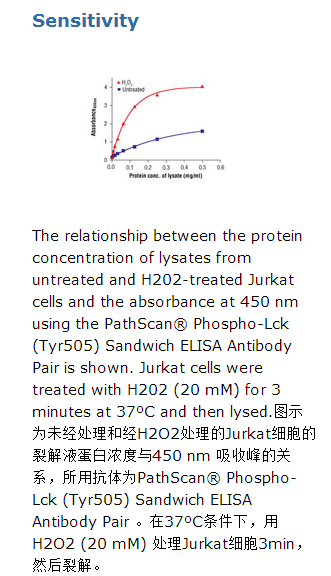 For Antibody Pair specificity and sensitivity, please refer to the corresponding PathScan® Sandwich ELISA Kit. Note: This antibody pair detects proteins from the indicated species, as determined through in-house testing, but may also detect homologous proteins from other species.