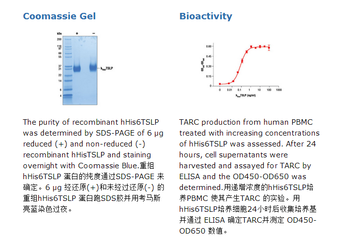 CST公司生产的人重组蛋白His6TSLP (hHis6TSLP) Tyr29-Gln159 (Accession #NP_149024)是从人的293细胞表达而来。重组的hHis6TSLP包含两个点突变(R127A和R130S),以避免弗林蛋白酶的剪切。重组的TSLP蛋白在N-末端有His6标签,蛋白分子量据推算为17,352Da。DTT-还原的蛋白和未还原的蛋白作为31kDa的蛋白而迁移。在SDS-PAGE中具稍低的迁移率是由于糖基化。重组hHis6TSLP蛋白的N-末端序列通过测序得到。6 μg 还原 (+) 和 非还原的(-) 重组hHis6TSLP通过SDS-PAGE检测,纯度大于98%,所有批次的纯度均高于98%。hHis6TSLP的生物活性是通过诱导PBMC产生TARC 能力的实验来确定的。每个批次的ED50在50-200 pg/ml之间。