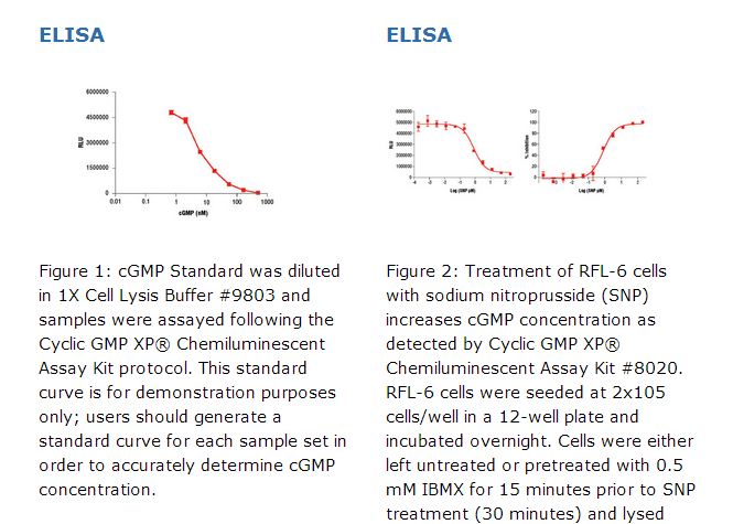 此试剂盒的免疫活性经由以下物质测试:ADP, AMP, ATP, cAMP, cGMP, cIMP, cTMP, CTP, GDP, GMP以及GTP。在cIMP中观察到相对较小的交叉反应,但cGMP的敏感性是其100倍。在测试的各物质中没有观察到其它交叉反应。试剂盒对cGMP的敏感性,如图1所示,范围为2-200nM。 特异性处理后的细胞cGMP水平的变化如图2(low passage RFL-6细胞)所示。Cyclic GMP XP Chemiluminescent Assay Kit是一个竞争性酶联免疫试验,用以分析目标细胞和组织的cGMP水平。此实验中,cGMP被发现在测试样本中与固定数量的HRP连接的cGMP竞争结合固定在96孔板上的抗cGMP XP兔单克隆抗体。接下来的洗涤移除了多余的样本cGMP和HRP连接的cGMP,然后加入Chemiluminescent(化学发光剂)以显色。由于此法的竞争性,使用相对发光单位(RLU)测量的发光强度与样本中cGMP的数量呈反比。使用cGMP标准溶液进行发光值测量,可计算出目标样本中cGMP的绝对数量。环鸟苷酸3'-5'-单磷酸酶(cGMP)是一个重要的多功能第二信使,在几乎所有物种不同类型的细胞中涉及许多信号转导通路(1)。细胞内cGMP由鸟苷酸环化酶(GC)催化GTP形成,由磷酸二酯酶(PDE)水解降解(1,2)。GC的两个独特的家族已经确定:可溶性鸟苷酸环化酶(sGC),对一氧化氮反应并和细胞膜结合;颗粒鸟苷酸环化酶(pGC),对不同的细胞外激动剂反应,包括肽类激素,细菌毒素和自由基(2,3)。磷酸二酯酶由11个亚型形成一个超家族,对cAMP和cGMP的特异性各异(4)。cGMP通过激活cGMP依赖的激酶调节细胞生理功能,调节cGMP依赖的离子通道或转运体,通过PDE进行水解降解(1,4)。介于其具有多个效应分子,cGMP在调节多种生理和病理过程中扮演重要角色,例如血管平滑肌运动、肠液和电解质平衡以及视网膜光电转换(1,5)。