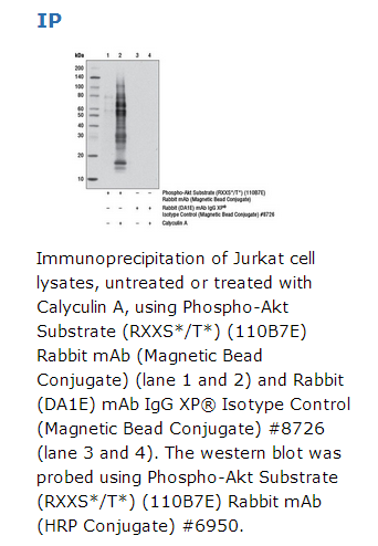 Phospho-Akt Substrate (RXXS*/T*) (110B7E) Rabbit mAb (Magnetic Bead Conjugate)识别包含-3位上有精氨酸的磷酸化丝氨酸/苏氨酸的肽段和蛋白。此抗体与包含-5、-3位上有精氨酸的磷酸化丝氨酸/苏氨酸的肽段有部分的交叉反应。(美国专利号:6,441,140、6,982,318、7,259,022、7,344,714;U.S.S.N. 11,484,485;及其对应的国外部分)。该单克隆抗体用合成的磷酸化Akt底物免疫动物制备。CST生产的此抗体通过共价结合肼基烟酰胺修饰的抗体与甲酰苯甲酰胺修饰的磁珠而固定。Phospho-Akt Substrate (RXXS*/T*) (110B7E) Rabbit mAb (Sepharose Bead Conjugate)在磷酸化Akt底物蛋白的免疫共沉淀分析中有用。精氨酸导向的激酶或AGC家族激酶是很重要的激酶,包括cAMP依赖的蛋白激酶(PKA)、cGMP依赖的蛋白激酶(PKG)、蛋白激酶C、Akt和RSK。这些激酶有相同的底物特异性,-3位上有精氨酸,与磷酸化的丝氨酸和苏氨酸相关(1,2)。Akt在介导细胞内关键反应中扮演重要角色,包括细胞生长和生存、血管生成和转录调节(3-5)。目前已经发现一些Akt底物(如GSK-3、Bad、caspase-9),但还有很多重要底物等待发现。Akt磷酸化保守序列中精氨酸-5、-3位置的丝氨酸/苏氨酸(6)。磷酸化Akt底物特异性抗体由Cell Signaling Technology公司提供,用于研究Akt磷酸化调节和精氨酸导向的激酶,也可以用于高通量药物发现。