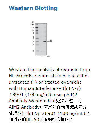 Polyclonal antibodies are produced by immunizing animals with a synthetic peptide corresponding to residues surrounding Pro250 of human AIM2 protein. Antibodies are purified by protein A and peptide affinity chromatography.