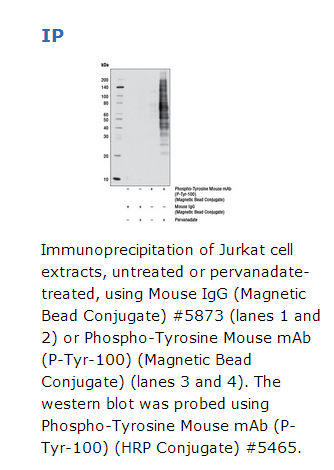 Phospho-Tyrosine Mouse mAb (P-Tyr-100) (Magnetic Bead Conjugate) contains high affinity beads. ELISAs against a wide variety of phosphopeptides indicate that P-Tyr-100 binds phospho-Tyr in a manner largely independent of the surrounding amino acid sequence. 2D gel western blot analysis of pervanadate-treated cell extracts shows that P-Tyr-100 interacts with a broad range of tyrosine-phosphorylated proteins. P-Tyr-100 does not cross-react with peptides containing phospho-Ser or phospho-Thr. (U.S. Patent No's.: 6,441,140; 6,982,318; 7,259,022; 7,344,714; U.S.S.N. 11,484,485; and all foreign equivalents.)
