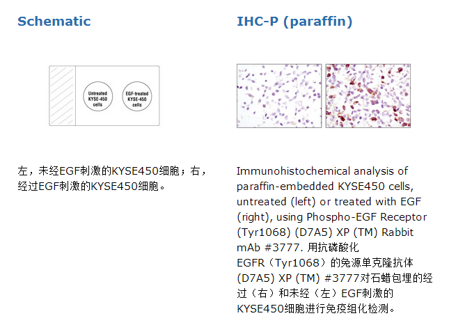 Each control slide contains formalin fixed, paraffin-embedded KYSE 450 cells, both untreated and treated with EGF, that serve as a control for Phospho-EGFR immunostaining. Western blot analysis was performed on extracts derived from the same cells to verify the efficacy of the EGF treatment.
