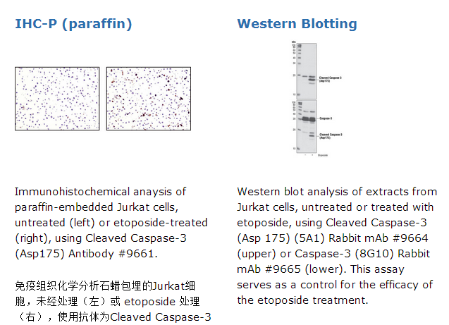 Each control slide contains formalin fixed, paraffin-embedded Jurkat cells, both untreated and treated with etoposide, that serve as a control for cleaved caspase-3 (Asp 175) immunostaining. Western blot analysis was performed on extracts derived from the same cells to verify the efficacy of the etoposide treatment.
