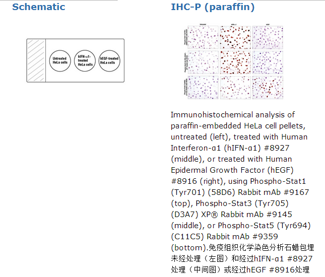 Each control slide contains formalin fixed, paraffin-embedded 786-0 cells, both untreated and treated with interferon alpha (IFN-α), that serve as a control for Phospho-Stat1 (Tyr701), Phospho-Stat3 (Tyr705) and Phospho-Stat5 (Tyr694) immunostaining. Western blot analysis was performed on extracts derived from the same cells to verify the efficacy of the IFN-alpha treatment. SignalSlide™ Phospho-Stat1/3/5 IHC Control slides have not been tested as controls for Phospho-Stat1 (Ser727) or Phospho-Stat3 (Ser727) immunostaining.
