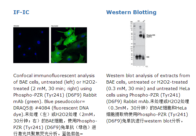磷酸化PZR (酪氨酸241) (D6F9)兔源单抗仅在241位酪氨酸磷酸化时识别内源性PZR 蛋白水平。单抗由合成肽段免疫动物产生,该合成肽段对应人PZR蛋白的241位酪氨酸附近残基。PZR(蛋白零点相关)是免疫球蛋白超家族蛋白,通过胞内免疫受体酪氨酸为基础的抑制性基序(ITIMs)特异结合酪氨酸激酶SHP-2(1,2)。PZR 被c-Src, c-Fyn, c-Lyn, Csk, 和 c-Abl磷酸化(3)。PP1,Src家族激酶抑制剂,抑制PZR磷酸化(4,5)。有三种选择性剪接异构体,命名为PZR, PZRa, 和 PZRb;PZRa 和 PZRb缺乏ITIMs(6,7)。PZR是主要的ConA受体,通过c-Src在细胞信号中起重要作用(4)。PZR在多种细胞中表达,定位在BAECs和间皮瘤细胞的细胞接触和胞内颗粒中。PZR 涉及细胞粘附蛋白,可能涉及SHP-2依赖的信号通路内皮细胞接触中(3)。PZR的高酪氨酸磷酸化在努南综合征的小鼠模型的胚胎发育中被观察到(8)。利用ConA处理或双氧水处理,两个PZR胞内ITIM酪氨酸位点241和263被磷酸化(4,8)。这两个位点的磷酸化帮组招募SHP-2到PZR,PZR改变SHP-2的磷酸化酶活性,影响它的下游信号(5,8,9)。