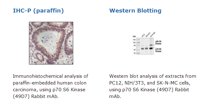 p70 S6 kinase is a mitogen activated Ser/Thr protein kinase that is required for cell growth and G1 cell cycle progression (1,2). p70 S6 kinase phosphorylates the S6 protein of the 40S ribosomal subunit and is involved in translational control of 5' oligopyrimidine tract mRNAs (1). A second isoform, p85 S6 kinase, is derived from the same gene and is identical to p70 S6 kinase except for 23 extra residues at the amino terminus, which encode a nuclear localizing signal (1). Both isoforms lie on a mitogen activated signaling pathway downstream of phosphoinositide-3 kinase (PI-3K) and the target of rapamycin, FRAP/mTOR, a pathway distinct from the Ras/MAP kinase cascade (1). The activity of p70 S6 kinase is controlled by multiple phosphorylation events located within the catalytic, linker and pseudosubstrate domains (1). Phosphorylation of Thr229 in the catalytic domain and Thr389 in the linker domain are most critical for kinase function (1). Phosphorylation of Thr389, however, most closely correlates with p70 kinase activity in vivo (3). Prior phosphorylation of Thr389 is required for the action of phosphoinositide 3-dependent protein kinase 1 (PDK1) on Thr229 (4,5). Phosphorylation of this site is stimulated by growth factors such as insulin, EGF and FGF, as well as by serum and some G-protein-coupled receptor ligands, and is blocked by wortmannin, LY294002 (PI-3K inhibitor) and rapamycin (FRAP/mTOR inhibitor) (1,6,7). Ser411, Thr421 and Ser424 lie within a Ser-Pro-rich region located in the pseudosubstrate region (1). Phosphorylation at these sites is thought to activate p70 S6 kinase via relief of pseudosubstrate suppression (1,2). Another LY294002 and rapamycin sensitive phosphorylation site, Ser371, is an in vitro substrate for mTOR and correlates well with the activity of a partially rapamycin resistant mutant p70 S6 kinase (8).