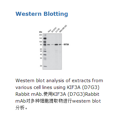 KIF3A (D7G3)Rabbit mAb可以识别内源性总的KIF3A 蛋白。单克隆抗体由合成肽段免疫动物产生,该肽段与人KIF3A蛋白羧基端附近氨基酸一致。驱动蛋白超家族(KIFs)是一种分子马达驱动膜结合细胞器和其他大分子(例如蛋白,核酸)的方向性的,微管依赖的细胞内转运.KIFs的细胞内转运功能对于多种细胞功能是根本性的,包括有丝分裂和减数分裂,运动/迁移,激素和神经递质的释放,以及分化(1-4)。KIF-介导的胞内转运被破坏后会与一系列的病理状态相关,从肿瘤发生到高阶脑损伤,例如学习和记忆(4-6)。驱动蛋白超家族蛋白3A(KIF3A)是驱动蛋白-2复合物的重要组分(7)。KIF3A和它的横向同源物KIF3B结合形成异二聚体马达蛋白,具有ATP依赖的,plus-end-directed微管滑动作用(8)。该异二聚体的尾部与驱动蛋白-相关蛋白3(KAP3)集合,协助KIF3A/3B马达蛋白与它的cargo结合(7,8)。最近在多个模式生物中的研究证明驱动蛋白家族蛋白,包括KIF3A,在纤毛的形成和功能上具有重要作用(9)。特别地是,KIF3A介导了纤毛依赖的蛋白-蛋白相互作用发挥了转导经典Hedgehog信号通路(10)。