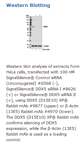 CST recommends transfection with 100 nM DDX5 siRNA II 48 to 72 hours prior to cell lysis. For transfection procedure, follow protocol provided by the transfection reagent manufacturer. Please feel free to contact CST with any questions on use.