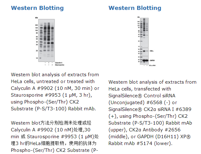Phospho-(Ser/Thr) CK2 Substrate (P-S/T3-100) Rabbit mAb兔单抗能够检测内源性的含有CK2 磷酸化共有序列pS/pTDXE 基序的蛋白。该抗体是研究CK2底物的有力工具。该单克隆抗体是经由合成的含有T*DXE基序的多肽免疫动物制备。Casein Kinase II (CK2)是一个高度保守、广泛表达,具有组成型活性的四聚体Ser/Thr 蛋白激酶,具有多种参与细胞周期进程、凋亡、转录、炎症以及DNA损伤应激等一系列细胞进程调控的底物。研究发现,CK2与病毒感染、癌症及其他疾病相关(1-5)。CK2底物包含多种酸性残基(Asp和 Glu),位于磷酸化Ser或Thr残基的下游。CK2底物的共有序列是pS/pTD/EXD/E,最关键的是+3 位的氨基酸残基,之后是+1 位的氨基酸残基(6)。