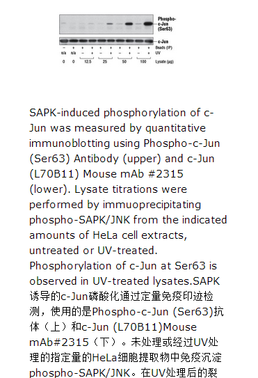 The SAPK/JNK Kinase Assay Kit (Nonradioactive) provides all the reagents necessary to measure SAPK/JNK activity in the cell. A phospho-SAPK/JNK Rabbit mAb linked to agarose beads is used to pull down SAPK enzyme from cell extracts. Upon addition of kinase buffer, c-Jun fusion protein and ATP, SAPK phosphorylates the c-Jun substrate. Phospho-c-Jun (Ser63) Antibody can then be used to measure SAPK activity by immunoblotting.