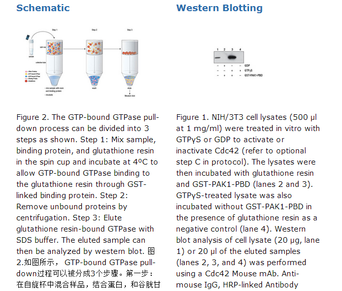 The Active Cdc42 Detection Kit provides all reagents necessary for measuring activation of Cdc42 GTPase in the cell. GST-PAK1-PBD fusion protein is used to bind the activated form of GTP-bound Cdc42, which can then be immunoprecipitated with glutathione resin. Cdc42 activation levels are then determined by western blot using a Cdc42 Mouse mAb.