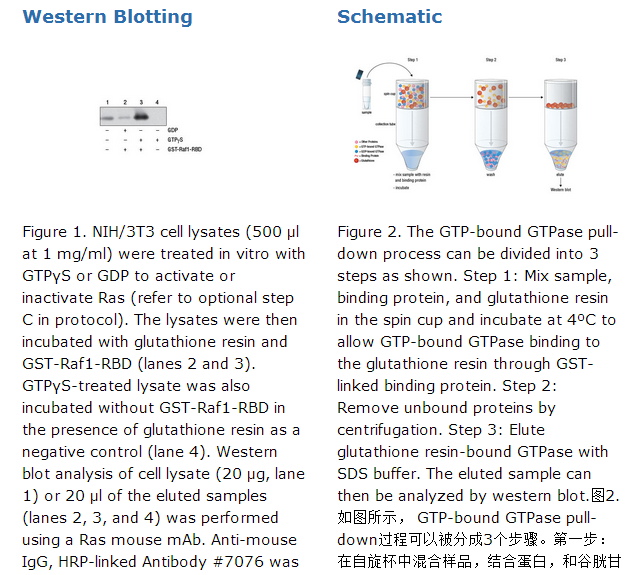 The Active Ras Detection Kit provides all reagents necessary for measuring activation of Ras GTPase in the cell. GST-Raf1-RBD fusion protein is used to bind the activated form of GTP-bound Ras, which can then be immunoprecipitated with glutathione resin. Ras activation levels are then determined in western using a Ras mouse mAb.