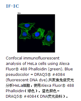 Actin, a ubiquitous eukaryotic protein, is the major component of the cytoskeleton. At least six isoforms are known in mammals. Nonmuscle β- and γ-actin, also known as cytoplasmic actin, are predominantly expressed in nonmuscle cells, controlling cell structure and motility (1). Actin exists mainly as a fibrous polymer, F-actin. In response to cytoskeletal reorganizing signals during processes such as cytokinesis, endocytosis, or stress, cofilin promotes fragmentation and depolymerization of F-actin, resulting in an increase in the monomeric globular form, G-actin (2). Phalloidin is a natually occuring toxic bicyclic peptide found in the deathcap toadstool, Amanita phalloides, that rapidly binds to F-actin with strong affinity (3).