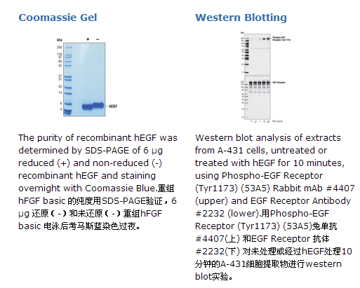 在Cell Signaling Technology公司的重组人源EGF (hEGF)天冬氨酸971-精氨酸1023(编号NM_0011963)经在大肠杆菌中表达生产。重组人源EGF在N-氨基末端有一个甲基化,分子量为6353. DTT还原和非还原蛋白游离基团为6kDa多肽。 预期在重组人源EGF的N-氨基末端MNSDS由氨基酸测序验证。6 μg还原和非还原的重组人源EGF 由SDS-PAGE测定大于98%。所有批次产品纯度均大于98%。重组人源EGF的生物活性由MCF10A细胞增殖实验测定。其每个批次的再ED50在 0.10-0.60 ng/ml之间。每1 μg hEGF中所含内毒素小于0.01 ng。有载体:每1 μg hEGF由含有20 μg BSA的pH 7.2的PBS 0.22微米过滤冻干。无载体:pH 7.2的PBS 0.22微米过滤冻干。EGF存在于上皮细胞,成纤维细胞和许多其他的细胞类型中(1,2)。低分子量可溶型EGF由一个分子量超过130,000的跨膜前体蛋白经蛋白水解生成(1,2)。可溶型和跨膜EGF都是有活性的(2)。EGF可以诱导多种细胞包括肿瘤来源的细胞增殖,分化和存活(1-3)。EGF家族和ErbB/HER EGF受体家族有许多成员。EGF结合ErbB1/HER1诱导同源二聚化或与其他ErbB/HER成员的异源二聚化(1)。EGF,EGF家族成员,EGF受体和它们的信号通路涉及到多种癌症,可以作为介入治疗的靶点(1,2)。