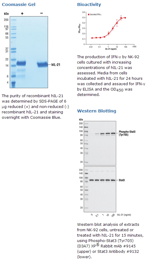 CST公司生产的人源重组蛋白IL-21 (hIL-21) Gln30-Ser155 (Accession # NM_021803)是从人源293细胞表达而来。重组的hIL-21蛋白在末端没有标签,未糖基化的蛋白分子量据推算为15,463Da。DTT-降解蛋白和未降解蛋白作为一个16kDa的蛋白而转移。未降解的蛋白具有稍高的迁移率与分子内的胱氨酸有关。重组hIL-21蛋白的N-末端QGQDR的序列通过测序得到。