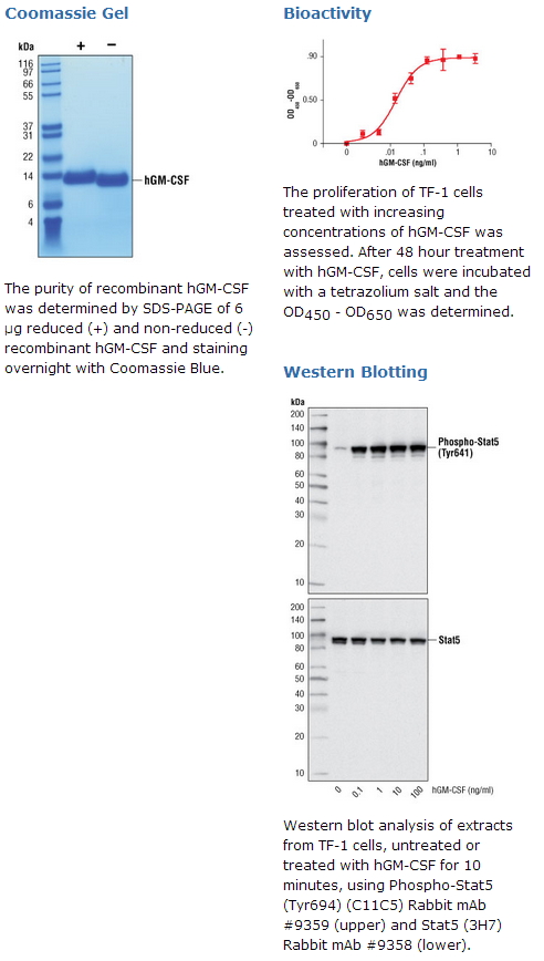 CST公司生产的人源重组蛋白GM-CSF (hGM-CSF) Ala18 - Glu144 (Accession # NM_000758)是从大肠杆菌细胞表达而来。重组的hGM-CSF蛋白在N-末端没有Met标签,蛋白分子量据推算为14,477Da。DTT-降解蛋白作为一个14kDa的蛋白转移。未降解的蛋白的迁移率稍高是因为分子内的胱氨酸存在。重组hGM-CSF 蛋白的N-末端APARS的序列通过测序得到。6 μg 还原 (+) 和 非还原的(-) hIL-17A/F通过SDS-PAGE检测,纯度大于98%,所有批次的纯度均高于98%。hGM-CSF的生物活性是通过TF-1细胞增殖来确定的。每个批次的ED50在5-30 pg/ml之间。GM-CSF 是通过活化的T细胞,NK细胞和巨噬细胞产生(1,5)。靶标细胞包括粒性白细胞,单核细胞前体和经过分化的一系列的骨髓细胞(1,2,3)。很多的靶标细胞需要GM-CSF才能生存。GM-CSF 诱导增殖,并参与造血细胞的分化成树状细胞,它在干细胞分化的信号通路上也是主要的因素之一。GM-CSF 激活骨髓细胞的功能,所以它连先天免疫和获得性免疫并推进抗肿瘤免疫(4)。GM-CSF受体由GM-CSFRα和普遍的 β链, βC 组成,这同时也被IL-3和 IL-5所利用(1)。GM-CSF的结合起始了 Jak2, Stat5 和 PI3K/Akt 信号通路(1)。内毒素含量:小于0.01 ng /1 μg hGM-CSF。
