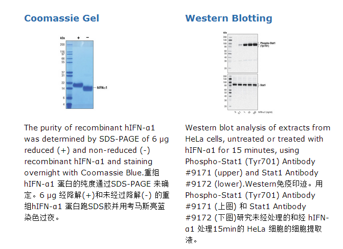 人源融合蛋白IFN-α1 (hIFN-α1) Cys24 - Asp189 (Accession # NP_076918)是由CST公司生产,此蛋白是在大肠杆菌中表达的。重组的hIFN-α1 蛋白在N-末端没有Met,其分子量据推算为19,386Da。DTT-降解蛋白迁移时是作为一个18 kDa 的多肽而转移,未降解的蛋白由于有cystines存在所以迁移时是作为一个14 kDa 的多肽而转移。重组hIFN-α1 蛋白的N-末端CDLPE的序列通过测序得到。6 μg 还原 (+) 和 非还原的(-) hIFN-α1通过SDS-PAGE检测,纯度大于98%,所有批次的纯度均高于98%。hIFN-α1 的生物活性是通过病毒保护实验来确定的。每个批次的ED50值在20 - 60 pg/ml之间。内毒素含量小于0.01 ng/1 μg hIFN-α1。