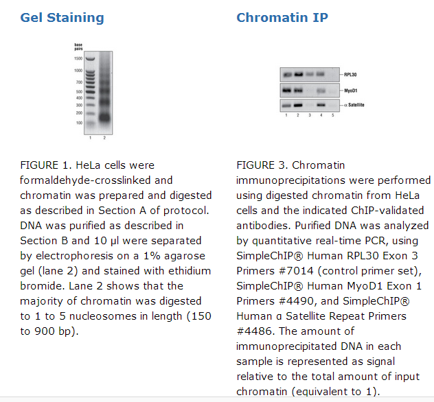 The SimpleChIP® Enzymatic Chromatin IP Kit (Agarose Beads) contains the buffers and reagents necessary to perform up to 6 chromatin preparations and 30 chromatin immunoprecipitations and is optimized for 4 X 107 cells per experiment. A complete assay can be performed in as little as two days and can easily be scaled up or down for use with more or fewer cells. Cells are fixed with formaldehyde and lysed, and chromatin is fragmented by partial digestion with Micrococcal Nuclease to obtain chromatin fragments of 1 to 5 nucleosomes. Enzymatic fragmentation of chromatin is much milder than sonication and eliminates problems resulting from variability in sonication power and emulsification of chromatin during sonication, which can result in incomplete fragmentation of chromatin or loss of antibody epitopes due to protein denaturation and degradation. Chromatin immunoprecipitations are performed using ChIP-validated antibodies and ChIP-Grade Protein G Agarose Beads. After reversal of protein-DNA cross-links, the DNA is purified using DNA purification spin columns, allowing for easy and efficient recovery of DNA and removal of protein contaminants without the need for phenol/chloroform extractions and ethanol precipitations. The enrichment of particular DNA sequences during immunoprecipitation can be analyzed by standard PCR, quantitative real-time PCR, or amplification for ChIP on chip, sequencing or cloning techniques. The SimpleChIP® Kit also provides important controls to ensure a successful ChIP experiment. The kit contains a positive control Histone H3 Antibody, a negative control Normal Rabbit IgG Antibody and primer sets for PCR detection of the human and mouse ribosomal protein L30 (RPL30) genes. Histone H3 is a core component of chromatin and is bound to most DNA sequences throughout the genome, including the RPL30 locus. Thus, the Histone H3 Antibody provides a universal positive control that should enrich for almost any locus examined.