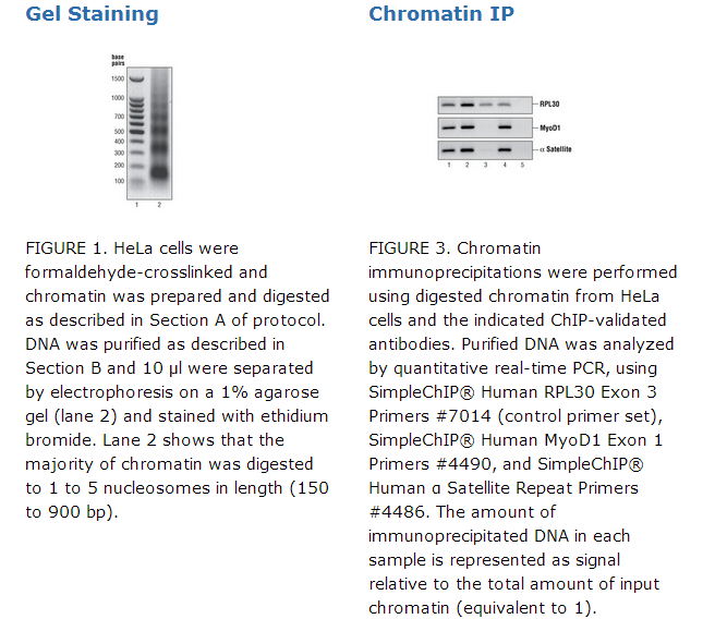 The SimpleChIP® Enzymatic Chromatin IP Kit (Magnetic Beads) contains the buffers and reagents necessary to perform up to 6 chromatin preparations and 30 chromatin immunoprecipitations and is optimized for 4 X 107 cells per experiment. A complete assay can be performed in as little as two days and can easily be scaled up or down for use with more or fewer cells. Cells are fixed with formaldehyde and lysed, and chromatin is fragmented by partial digestion with Micrococcal Nuclease to obtain chromatin fragments of 1 to 5 nucleosomes. Enzymatic fragmentation of chromatin is much milder than sonication and eliminates problems resulting from variability in sonication power and emulsification of chromatin during sonication, which can result in incomplete fragmentation of chromatin or loss of antibody epitopes due to protein denaturation and degradation. Chromatin immunoprecipitations are performed using ChIP-validated antibodies and ChIP-Grade Protein G Magnetic Beads. After reversal of protein-DNA cross-links, the DNA is purified using DNA purification spin columns, allowing for easy and efficient recovery of DNA and removal of protein contaminants without the need for phenol/chloroform extractions and ethanol precipitations. The enrichment of particular DNA sequences during immunoprecipitation can be analyzed by standard PCR, quantitative real-time PCR, or amplification for ChIP on chip, sequencing or cloning techniques. The SimpleChIP® Kit also provides important controls to ensure a successful ChIP experiment. The kit contains a positive control Histone H3 Antibody, a negative control Normal Rabbit IgG Antibody and primer sets for PCR detection of the human and mouse ribosomal protein L30 (RPL30) genes. Histone H3 is a core component of chromatin and is bound to most DNA sequences throughout the genome, including the RPL30 locus. Thus, the Histone H3 Antibody provides a universal positive control that should enrich for almost any locus examined