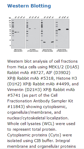 This kit is intended to be used with cultured cell lines that are either adherent or in suspension. The Cell Fractionation Kit allows for the determination of the subcellular localization of proteins through the separation into three distinct fractions. Efficiency of separation can be measured using Cell Signaling Technology's Cell Fractionation Antibody Sampler Kit #11843.本试剂盒用于贴壁或悬浮培养的细胞系。