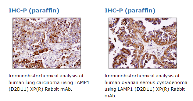 LAMP1 (D2D11) XP® Rabbit mAb可以识别内源性总的LAMP1蛋白。单克隆抗体由合成的人LAMP1蛋白片段免疫动物产生。溶酶体-相关膜蛋白1和2(LAMP1和LAMP2)是两个丰度很高的溶酶体膜蛋白(1,2)。两者都是膜蛋白,位于溶酶体内腔隙在氨基端被高度糖基化,这会使蛋白免受蛋白酶解(3)。LAMP1的羧基端暴露在细胞质中,含有一个酪氨酸分选基序会靶向LAMP到溶酶体膜(4)。LAMP1和LAMP2有37%的序列同源性。LAMP1和LAMP2都涉及到调控溶酶体-吞噬体融合和胆固醇转运过程中的溶酶体活性(5,6)。