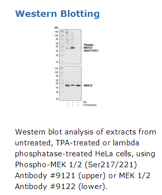Phospho-MEK1/2 (Ser217/221) Antibody detects endogenous levels of MEK1/2 only when activated by phosphorylation at Ser217/221. This antibody does not cross-react with related kinases including activated SEK (MKK4), MKK3 or MKK6. It will also react with MEK1/2 singly phosphorylated at Ser217 and singly phosphorylated at Ser221.
