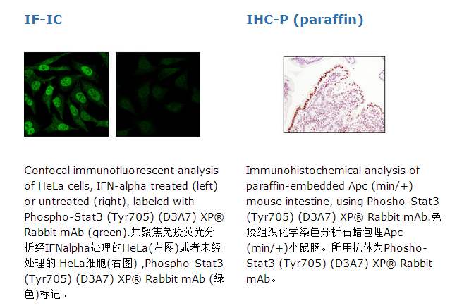 Phospho-Stat3 (Tyr705) (D3A7) XP® Rabbit mAb只能检测内源的在tyr705位点磷酸的 Stat3 蛋白。此抗体不与磷酸化的EGFR和对应的磷酸化酪氨酸残基的其它Stat 蛋白反应。单克隆抗体是通过合成鼠源对应的Stat3 Tyr705位点周围的磷肽段来免疫动物而获得。Stat3 转录因子是细胞因子和生长因子受体信号通路上重要的信号分子(1),并且被鼠科胚胎的发育所需要(2)。Stat3 在很多的人类肿瘤中是组成性激活的(3,4)并有潜在的支配原发性癌的可能(5) 而且也具有抗细胞凋亡的活性(3)。Stat3通过Tyr705位点的磷酸化而激活,从而导致它的二聚化,入核和DNA结合(6,7)。转录活性似乎受到 MAPK 或 mTOR 信号通路介导的Stat3 Ser727位点的磷酸化(8,9)。Stat3不同剪切形式的表达反应了其生物学功能,Stat3α (86 kDa) 和 Stat3β (79 kDa) 形式的表达比例依赖于细胞类型,配体方向或者细胞发育的成熟阶段(10)。值得注意的是Stat3β蛋白在C-末端转录活性区域缺少丝氨酸磷酸化位点(8)。