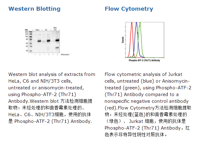 Phospho-ATF-2 (Thr71) Antibody detects endogenous levels of ATF-2 only when phosphorylated at threonine 71. This antibody does not cross-react with phosphorylated c-Jun, CREB or other transcription factors. It recognizes both Thr69/Thr71 dually phosphorylated ATF-2 and Thr71 singly phosphorylated ATF-2 equally well.