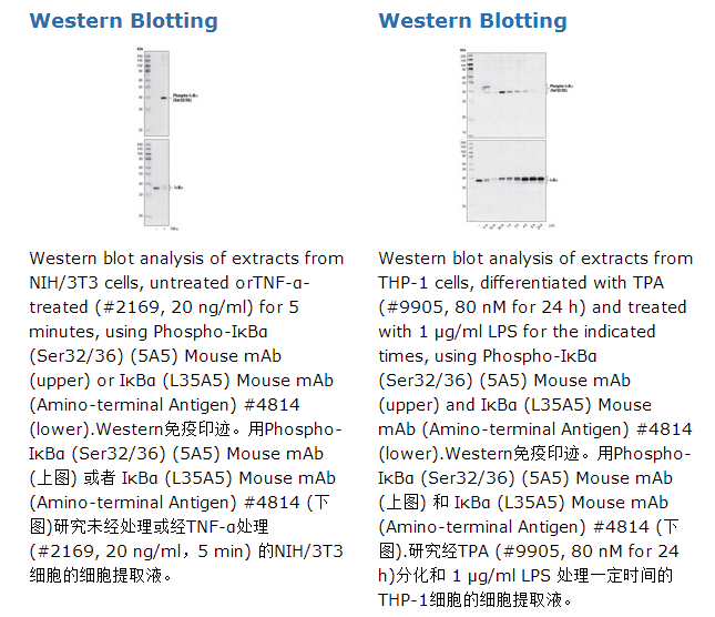 Phospho-IκBα (Ser32/36) (5A5) Mouse mAb抗体只能检测内源的在Ser32/36 位点磷酸化的IκBα蛋白。单克隆是通过合成人源的对应的IκBα Ser32/36位点周围的磷肽段来免疫动物而获得。NF-κB/Rel转录调控因子在细胞质中与IκB抑制蛋白结合以非活性形式存在(1-3)。磷酸化IκBα 的Ser32 和 Ser36位点后,蛋白水解酶体介导的降解使得 NF-κB释放激活并入核(3-7)。IκBα的磷酸化导致了Rel依赖的转录能够被很多胞外信号激活,包括炎症因子,生长因子和趋化因子 。能够磷酸化IκB这些活性位点的激酶已经得到了鉴定(8)。