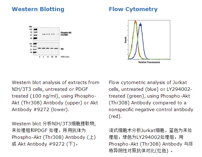 Phospho-Akt (Thr308) Antibody detects endogenous levels of Akt only when phosphorylated at Thr308. This antibody does not detect Akt phosphorylated at other sites or related kinases such as PKC and p70 S6 kinase.