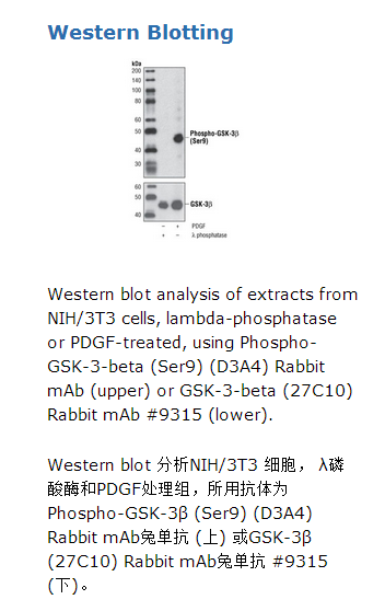 Phospho-GSK-3β (Ser9) (D3A4) Rabbit mAb兔单抗可以检测Ser9位点发生磷酸化GSK-3β 水平。单克隆抗体是采用合成的与人源GSK-3 β蛋白Ser9位点周围残基相对应的磷酸肽免疫动物生产的。糖原合酶激酶-3(GSK-3)最初被确认为是一种能在胰岛素的刺激下参与调节糖原合成的酶(1)。GSK-3是一个广泛表达的丝氨酸/苏氨酸蛋白激酶,可以磷酸化并抑制糖原合成酶的活性。GSK-3是PI3K/ Akt细胞存活通路上的一个关键下游分子,其活性可以被Akt介导的GSK-3α的Ser21位点和GSK-3β的Ser9位点的磷酸化抑制(2,3)。GSK-3不仅参与盘基网柄菌细胞命运的调控,而且是果蝇,爪蟾和哺乳动物发育过程中所需的Wnt信号通路的一个组成部分(4)。GSK-3还参与调节cyclin D1 蛋白降解和亚细胞定位(5)