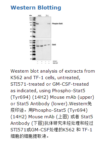 Phospho-Stat5 (Tyr694) (14H2) Mouse mAb鼠单抗只能检测内源水平在Tyr694位点磷酸化的Stat5a蛋白和在Tyr699位点磷酸化的Stat5b蛋白。抗体不与对应位点的酪氨酸残基磷酸化的Stat蛋白交叉反应。此单克隆抗体是通过合成对应鼠源性Stat5a Tyr694 位点周围的磷肽免疫动物而获得。Stat5的激活是通过一系列的配体的结合而完成,包括 IL-2, GM-CSF,生长激素和泌乳刺激素。磷酸化Tyr694位点对 Stat5的活性是必须的(1,2)。此位点的磷酸化是在红细胞生成素的作用下由Src介导而完成(3)。 Stat5在某些白血病类型的细胞中有组成性的活性(4)。用IL-3处理的内皮细胞中有磷酸化的Stat5,这就表明它参与了血管再生和细胞的运动(5)。在不同细胞类型中 Stat5a 和 Stat5b 是被独立调控和激活的。例如,干扰素处理后在U-937细胞中Stat5a的活性较强但在HeLa细胞中Stat5b的活性较强(6)。