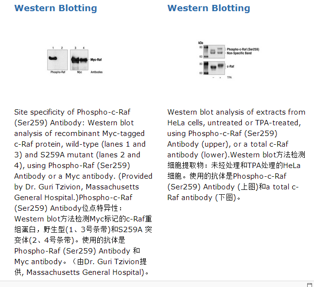 Phospho-c-Raf (Ser259) Antibody detects endogenous levels of c-Raf only when phosphorylated at Ser259.