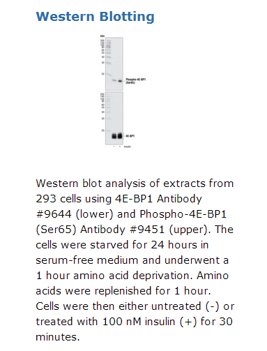 Phospho-4E-BP1 (Ser65) Antibody检测仅在Ser65位点磷酸化的内源性4E-BP1蛋白水平水平。该抗体也能够识别在丝氨酸101磷酸化的4E-BP1蛋白(参见应用文献, Wang et al. 2003)。通过人工合成小鼠4E-BP1 蛋白相应序列的多肽片段免疫动物从而制备多克隆抗体。通过蛋白A和多肽亲和层析纯化抗体。翻译抑制蛋白4E-BP1 (又称 PHAS-1)通过结合翻译起始因子eIF4E蛋白从而抑制帽子结构依赖的翻译。4E-BP1的过磷酸化干扰上述结合并且导致激活帽子结构依赖的翻译(1)。PI3 kinase/Akt通路和FRAP/mTOR激酶通路都调节4E-BP1蛋白的激活(2,3)。在体内4E-BP1多个位点残基被磷酸化(4)。通过FRAP/mTOR蛋白使4E-BP1在Thr37和Thr46位点磷酸化不能阻止它eIF4E结合,但这被认为是为随后在4E-BP1的Ser65和Thr70位点磷酸化进行准备(5)。