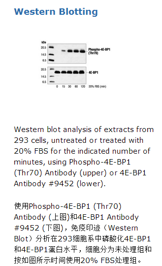 Phospho-4E-BP1 (Thr70) Antibody detects endogenous levels of 4E-BP1 only when phosphorylated at threonine 70. This antibody does not detect 4E-BP1 phosphorylated at other sites.