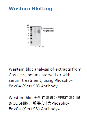 Phospho-Fox04 (Ser193) Antibody detects endogenous levels of Fox04 only when phosphorylated at serine 193. The antibody may detect phospho-Fox01 at 82 kDa.
