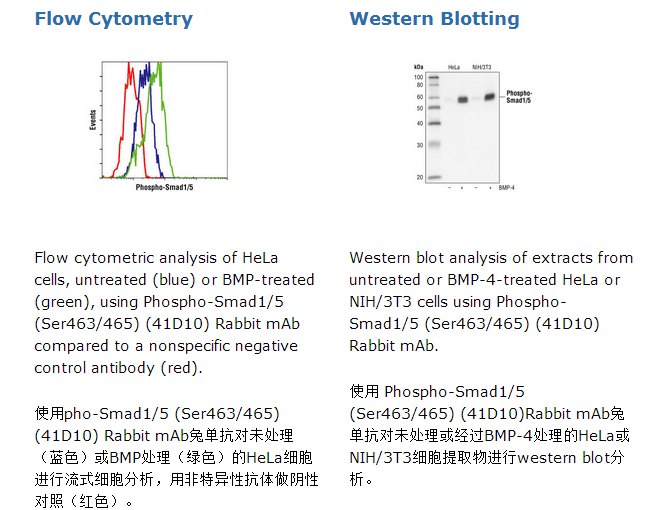 Phospho-Smad1/5 (Ser463/465) (41D10) Rabbit mAb兔单抗仅能识别463/465位丝氨酸双重磷酸化的内源性Smad1/5蛋白。本抗体与其他Smad相关蛋白没有交叉反应。合成与人源Smad5 蛋白的邻近463/465位丝氨酸氨基酸残基序列一致的磷酸化肽段,免疫动物获得单克隆抗体。骨形成蛋白由一大类信号分子组成,这些分子调控包括形态发生、细胞命运定向、增殖、分化以及凋亡在内的广泛重要过程[1,2]。BMP 受体为TGF-β家族丝氨酸/苏氨酸受体成员。配基的结合诱导多聚化、自磷酸化和相应受体的激活[3-5]。它们随后磷酸化Smad1蛋白的C-末端SSXS模体中的463位丝氨酸和465位丝氨酸,且磷酸化Smad5和Smad8中相应的位置。这些磷酸化的Smad与共激活的Smad4形成二聚体,转移到核内激活靶基因的转录[5]。促分裂原活化蛋白激酶MAPK和周期蛋白依赖性蛋白激酶8和9在Smad1的连接区域磷酸化相应残基包括丝氨酸206。进而募集Smurf1到接头区域导致Smad1的降解[6]。这一位点的磷酸化也招募YAP到接头区域促进Smad1的转录激活[7]。