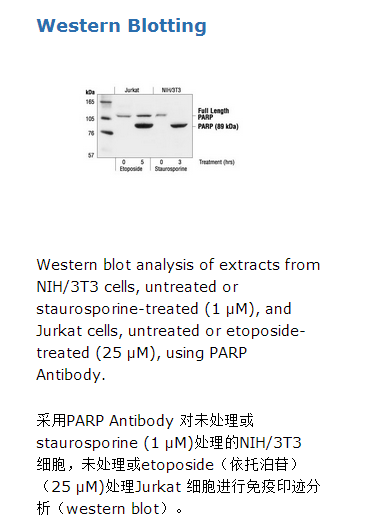 PARP Antibody detects endogenous levels of full length PARP1 (116 kDa), as well as the large fragment (89 kDa) of PARP1 resulting from caspase cleavage. The antibody does not cross-react with related proteins or other PARP isoforms.does not cross-react with related proteins or other PARP isoforms.