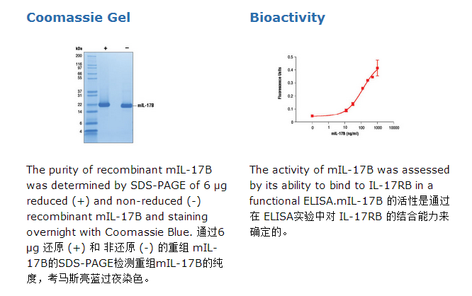 重组小鼠IL-17B (mIL-17B) His21-Phe180 (Accession #NP_062381)蛋白在大肠杆菌中表达。重组mIL-17B蛋白在氨基末端有Met残基,其分子量据推算为18,186Da。DTT-还原和未还原的蛋白接近19 kDa 多肽迁移的位置。重组 mIL-17B蛋白的氨基末端MHPRN的序列通过氨基酸测序得到。通过对6 μg 还原 (+) 和 非还原 (-) 的重组 mIL-17B进行SDS-PAGE检测,纯度大于98%。所有批次的纯度均大于98%。mIL-17B 的活性是通过在 ELISA实验中对 IL-17RB 的结合能力来确定的,每个批次的半数最大结合浓度为 0.1-1.0 µg/ml。每微克mIL-17B的内毒素含量小于 0.01 ng。