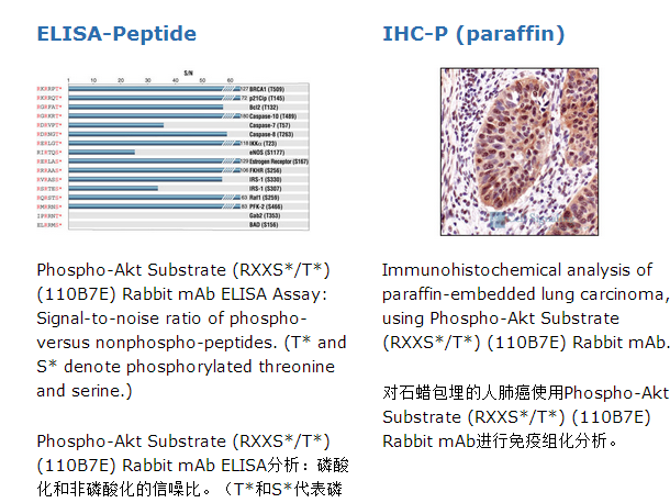 Phospho-(Ser/Thr) Akt Substrate Motif (RXXS*/T*) (110B7) Rabbit mAb兔单抗识别包含-3位上是精氨酸的磷酸化丝氨酸/苏氨酸的肽段和蛋白。此抗体与包含-5、-3位上是精氨酸的磷酸化丝氨酸/苏氨酸肽段有偏好的交叉反应。(美国专利号:6,441,140、6,982,318、7,259,022、7,344,714;U.S.S.N. 11,484,485;及所有国外相应专利)该单克隆抗体用合成的磷酸化Akt底物肽段免疫动物制备。精氨酸导向的激酶或AGC家族激酶是很重要的激酶,包括cAMP依赖的蛋白激酶(PKA)、cGMP依赖的蛋白激酶(PKG)、蛋白激酶C、Akt和RSK。这些激酶有相同的底物特异性,-3位上有精氨酸的丝氨酸和苏氨酸(1,2)。Akt在介导细胞内关键反应中扮演重要角色,包括细胞生长和生存、血管生成和转录调节(3-5)。目前已经发现一些Akt底物(如GSK-3、Bad、caspase-9),但还有很多重要底物等待发现。Akt磷酸化保守序列-5、-3位是精氨酸的丝氨酸/苏氨酸(6)。磷酸化Akt底物特异性抗体由Cell Signaling Technology公司研发,用于研究Akt磷酸化调节和精氨酸导向的激酶,也可以用于高通量药物发现。