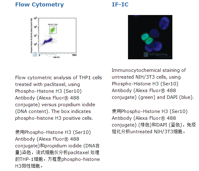 Polyclonal antibodies are produced by immunizing animals with a synthetic phosphopeptide corresponding to residues surrounding Ser10 of human histone H3. Antibodies are purified by protein A and peptide affinity chromatography. The antibody was conjugated to Alexa Fluor®488 under optimal conditions with an F/P ratio of 2-6.
