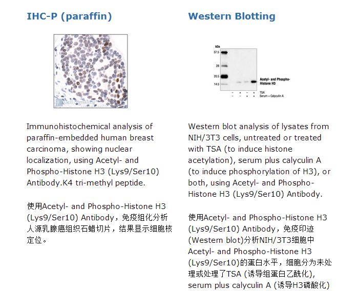 Acetyl- and Phospho- Histone H3 (Lys9/Ser10) Antibody detects endogenous levels of histone H3 only when modified both by acetylation at lysine 9 and phosphorylation at serine 10.