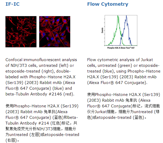 Phospho-Histone H2A.X (Ser139) (20E3) Rabbit mAb detects endogenous levels of H2A.X only when phosphorylated at serine 139.